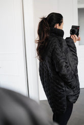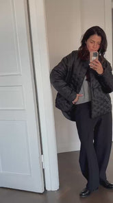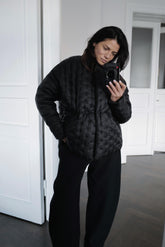 A very warm, quilted jacket with dropped shoulders, featuring a decorative collar crafted from unique tweed.