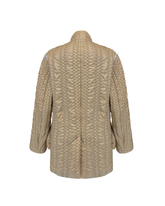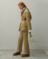 The SHORT GOLD QUILTED JACKET AW23/24, is a luxurious Italian polyester coat tailored with an oversized fit for extra comfort. Handmade in Latvia, the coat features an ethnic belt stitched to the coat for a unique touch. Stay warm and stylish this season with this sophisticated one-size coat. Comes with pants, like a set.
