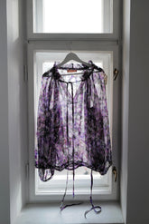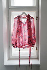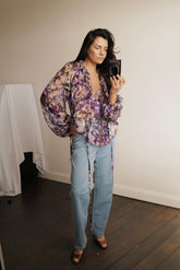 Our new Boho style blouse VALERY combines timeless sophistication with a flowing silhouette and graceful wide sleeves, crafted from exclusive floral print silk sourced from the renowned Como manufactory. Style it with jeans for casual elegance or pair with our linen skirt for a refined look. Adjustable drawstrings at the neckline and hem offer versatile styling options.